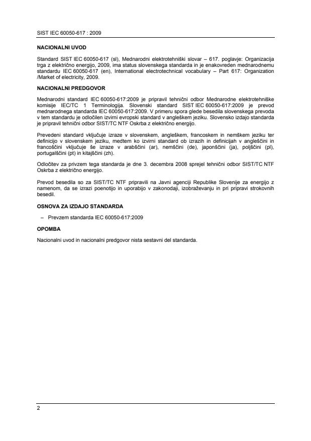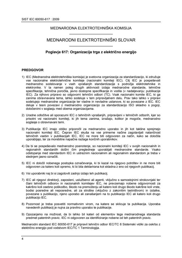 Z odpiranjem trga z električno energijo se je pojavila potreba, da se za to področje vzpostavi skupni slovar, ki bo vključeval izraze v zvezi z vsemi dejavniki na trgu in vmesniki med njimi ter tehnične in finančne izraze, ki imajo na trgu električne energije poseben pomen. Ta horizontalni standard je namenjen predvsem tehničnim odborom, ki pripravljajo standarde v skladu z načeli publikacije IEC Vodilo 108. Dolžnost tehničnih odborov je, da pri pripravi publikacij uporabljajo določila horizontalnih standardov, kjerkoli je to mogoče. Ta horizontalni standard ni namenjen samostojni uporabi, ampak se bo uporabljal le takrat, kadar se bodo druge publikacije sklicevale na njegovo vsebino ali ga bodo vključevale. Vsebina IEC 60050-617 je prosto dostopna na http://www.electropedia.org/. Electropedia (znana tudi kot "IEV Online") je največja svetovna podatkovna baza izrazov s področja elektrotehnike in elektronike, ki vsebuje več kot 20 000 izrazov in definicij.