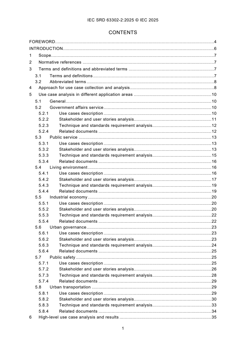 IEC SRD 63302-2:2025 is a standardization document published by the International Electrotechnical Commission (IEC). Its full title is "Smart city use case collection and analysis - Intelligent operations centre for smart cities - Part 2 : Use case analysis". This standard covers: IEC SRD 63302-2:2025 This SRD provides use cases collection and analysis, indentifies market relationship of relevant stakeholders, and scopes out capabilities and reference model of IOC and requirements for standards development in this field. It includes: a. Studying on the outline of the reference conceptual model of IOC and relevant characteristics, and identifying stakeholders, b. Collecting and analyzing on prospective user cases, especially for electrotechnical aspects, c. Summarizing market relationship among the stakeholders and the view of use cases-derived reference architecture model and capabilities landscape of IOC, d. Proposing the requirements for standards development in this field, particularly related to electrotechnical aspects. This SRD is for use by urban managers, solution providers, urban operators, citizens, and other relevant stakeholders, to identify the practices of IOC, and what tools they could use to implement this good practice. It also might help IOCs under development to identify the capabilities and standardization needs, and makes the city more desirable and smartness.