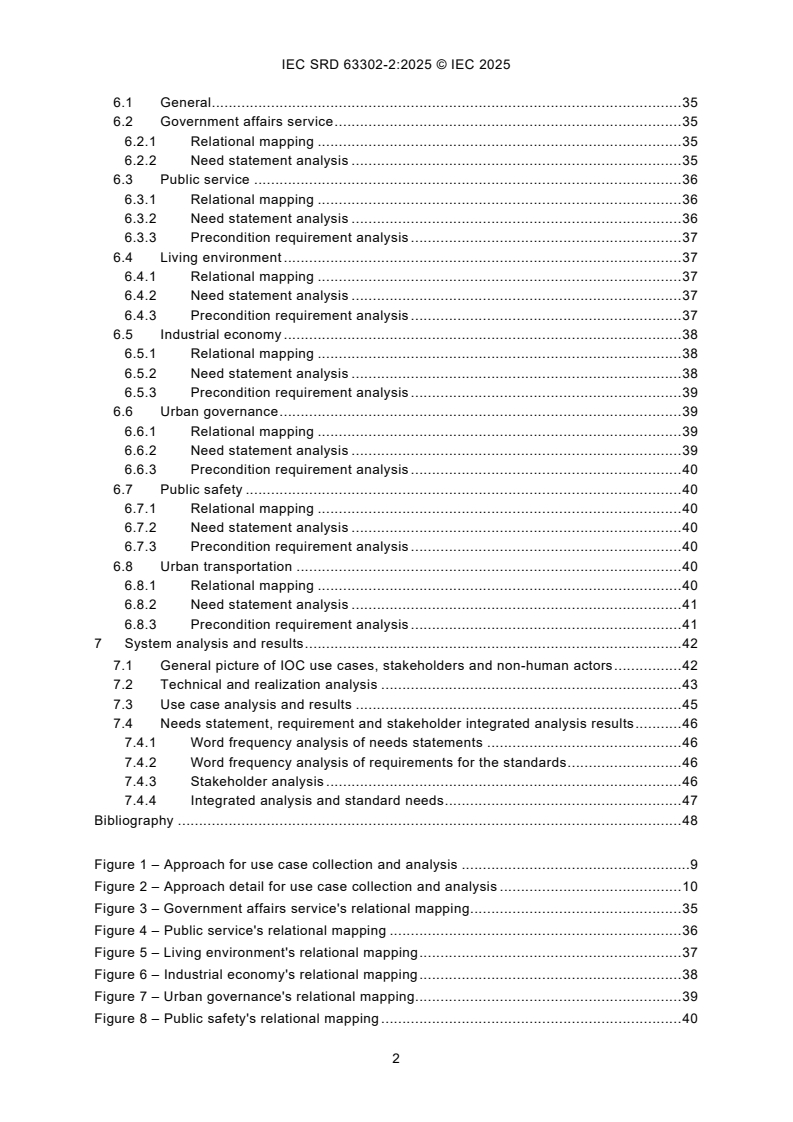 IEC SRD 63302-2:2025 This SRD provides use cases collection and analysis, indentifies market relationship of relevant stakeholders, and scopes out capabilities and reference model of IOC and requirements for standards development in this field. It includes: a. Studying on the outline of the reference conceptual model of IOC and relevant characteristics, and identifying stakeholders, b. Collecting and analyzing on prospective user cases, especially for electrotechnical aspects, c. Summarizing market relationship among the stakeholders and the view of use cases-derived reference architecture model and capabilities landscape of IOC, d. Proposing the requirements for standards development in this field, particularly related to electrotechnical aspects. This SRD is for use by urban managers, solution providers, urban operators, citizens, and other relevant stakeholders, to identify the practices of IOC, and what tools they could use to implement this good practice. It also might help IOCs under development to identify the capabilities and standardization needs, and makes the city more desirable and smartness.