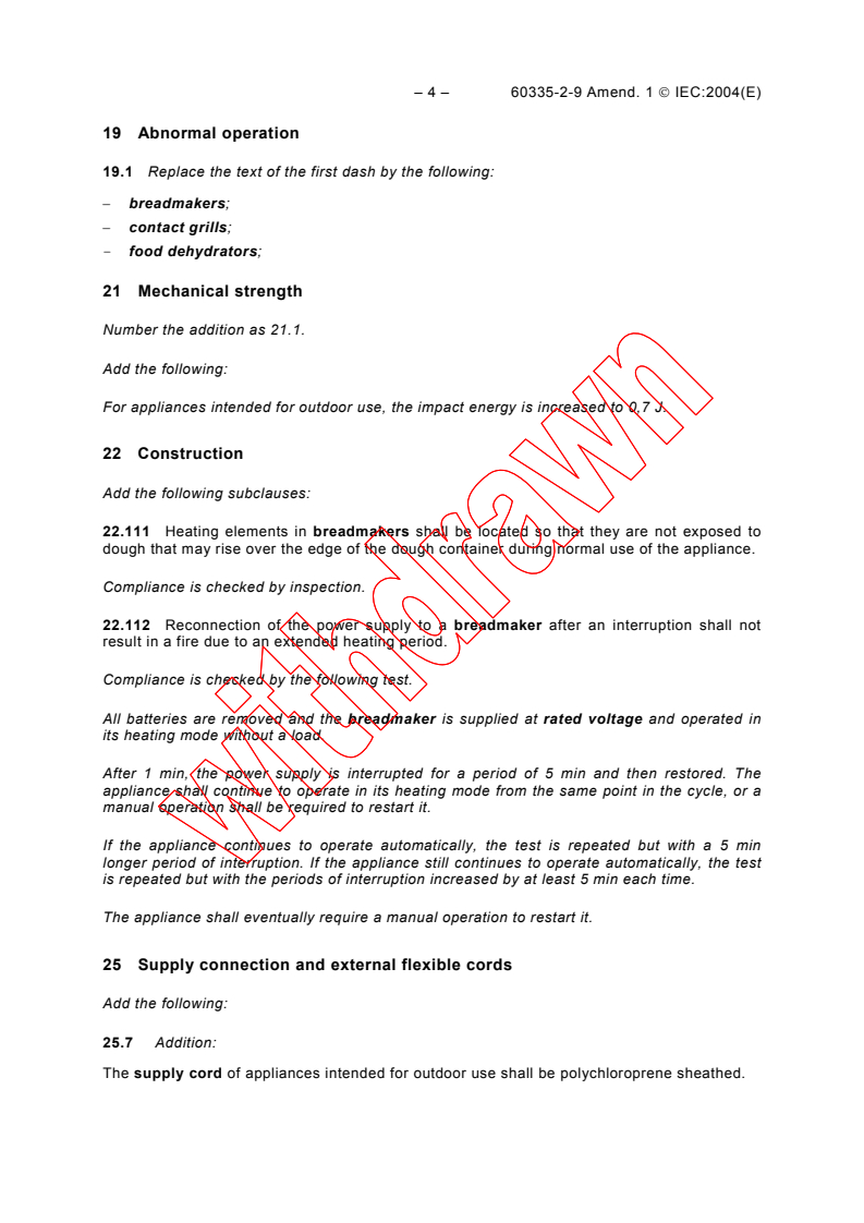 The amendment expands the scope to explicitly include breadmakers alongside grills and toasters. It clarifies normal operation conditions and abnormal scenarios expected during appliance use.Safety Requirements for Outdoor Use