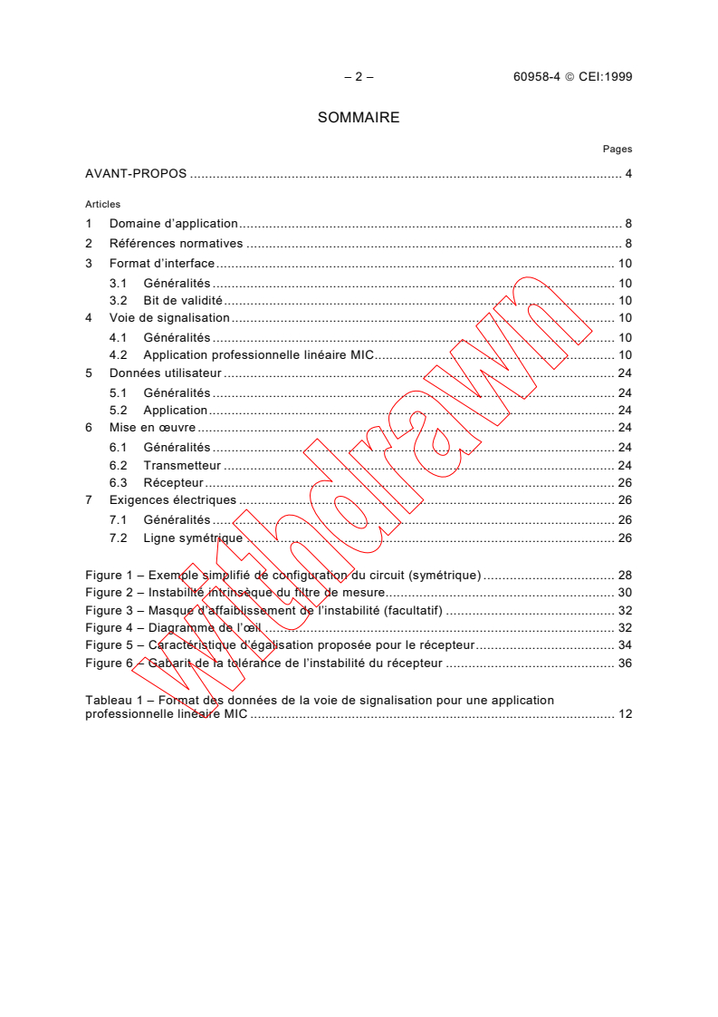 IEC 60958-4:1999 is a standard published by the International Electrotechnical Commission (IEC). Its full title is "Digital audio interface - Part 4: Professional applications". This standard covers: Describes a serial, uni-directional, self-clocking interface for the interconnection of digital audio equipment for professional applications. Is intended for use with shielded twisted-pair cables over distances of up to 100 m.