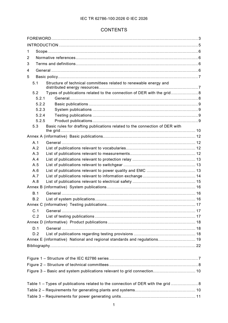 IEC TR 62786-100:2026 gives guidance for the drafting of IEC publications which relate, wholly or partly, to connection of distributed energy resources (DER) with the grid. Technical committees relevant to the connection of DER with grid are advised to follow the guidance given in this document when they prepare new publications and clauses relevant to the connection of DER with the grid, as well as when they revise existing publications so that consistent and harmonized standards can be delivered. Annex A, Annex B, Annex C, and Annex D list documents relevant to grid connection of DER in order to ensure that other IEC publications are consistent with these documents and to avoid overlapping each other. Table E.1 lists national and regional standards and regulations relevant to connecting DER with the grid.