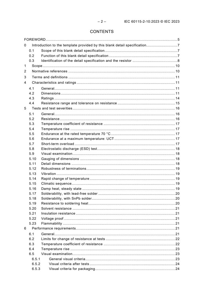 IEC 60115-2-10:2023 is a detail specification which specifies the characteristics and ratings of low-power film resistors with leads for use in electronic equipment, which are typically assembled in through-hole technology (THT) on circuit boards. This detail specification establishes test schedules and performance requirements permitting the quality assessment of the resistors covered herein according to the quality assessment procedures specified by IEC 60115-1:2020, Annex Q. This first edition cancels and replaces IEC 60115-2-1:1982. This edition constitutes a technical revision. This edition includes the following significant technical changes with respect to the previous edition: it employs the product classification based on application requirements as defined in the generic specification IEC 60115‑1:2020; it permits the specification of additional dimensional requirements concerning the eccentricity of termination wires and the coating extending onto wires; it provides for a tabulated presentation of resistance ranges in relationship to the temperature coefficient and the tolerance; it supports solderability testing for both traditional lead-bearing soldering and up-to-date lead-free soldering, as required; it introduces a test for the specimens’ robustness to electrostatic discharge; it introduces a test for the specimens’ resistance to solvents; it introduces a test for the flammability of the specimens; it employs consistent stability requirements grouped in stability classes; it supports the provision of detailed visual acceptance criteria; it includes the requirement for a visual examination of the primary and proximity packaging; it provides the correlated test schedules for a qualification approval and for subsequent quality conformance inspections side by side; it employs quality assessment procedures which meet the requirements of a zero-defect approach, which evades the use of historic AQL levels and the permission of non-conforming specimens in test groups; it provides for the inclusion of specific visual acceptance criteria, to be applied in addition to those given in Annex B of the sectional specification IEC 60115-2:2023; it provides for the optional coverage of 0 Ω resistors (jumpers) within the scope of the drafted detail specification; furthermore, it employs a new document structure, for which a transition guidance is provided in Annex X.