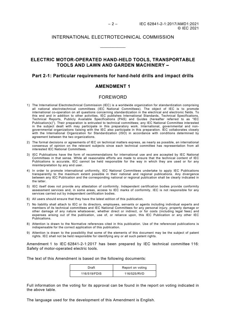 IEC 62841-2-1:2017/AMD1:2021 is a standard published by the International Electrotechnical Commission (IEC). Its full title is "Amendment 1 - Electric motor-operated hand-held tools, transportable tools and lawn and garden machinery - Safety - Part 2-1: Particular requirements for hand-held drills and impact drills". This standard covers: The content of the corrigendum 1 (2025-11) has been included in this copy.