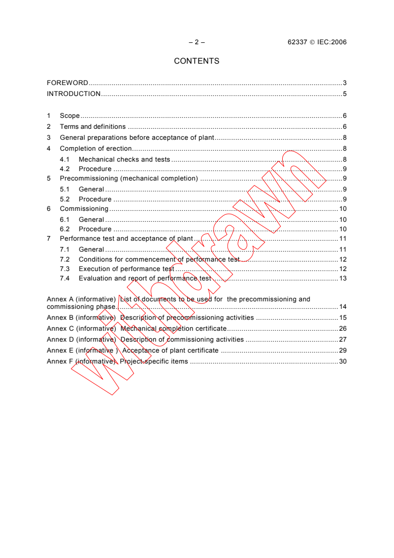 IEC 62337:2006 is a standard published by the International Electrotechnical Commission (IEC). Its full title is "Commissioning of electrical, instrumentation and control systems in the process industry - Specific phases and milestones". This standard covers: IEC 62337:2006 defines specific phases and milestones in the commissioning of electrical, instrumentation and control systems in the process industry. By way of example, it describes activities following the "completion-of-erection" milestone of the project and prior to the "acceptance-of-the-plant" phase by the owner. Such activities need to be adapted for each type of process/plant concerned. This bilingual version (2013-05) corresponds to the monolingual English version, published in 2006-11. It cancels and replaces IEC/PAS 62337 published in 2002. This first edition constitutes a technical revision.
