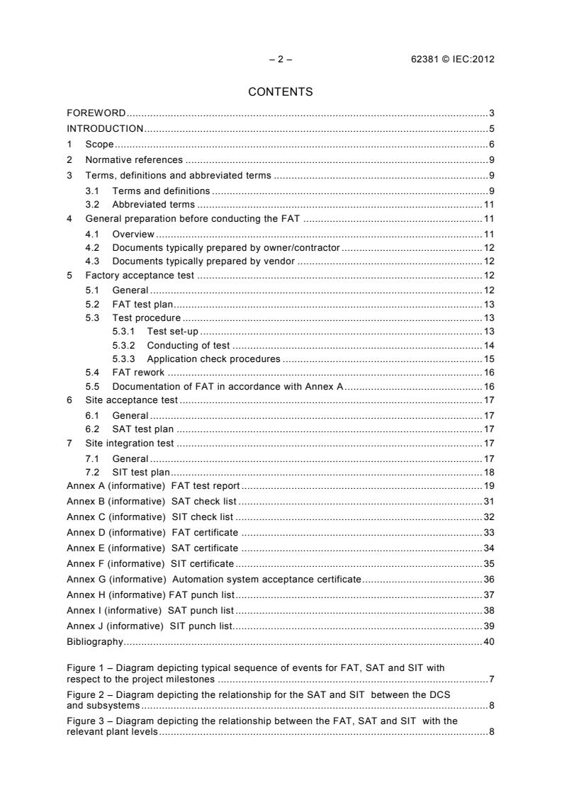 IEC 62381:2012 defines the procedures and specifications for the Factory Acceptance Test (FAT), the Site Acceptance Test (SAT), and the Site Integration Test (SIT). These tests are carried out to prove that the automation system is in accordance with the specification. The description of activities given in this standard can be taken as a guideline and adapted to the specific requirements of the process, plant or equipment. This second edition cancels and replaces the first edition published in 2006. This edition constitutes a technical revision. The main changes with respect to the previous edition are: The definition of the documents mentioned in this standard is in accordance with future IEC 62708.