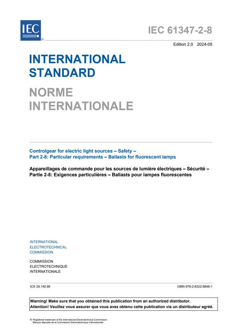 IEC 61347-2-8:2024 is a standard published by the International Electrotechnical Commission (IEC). Its full title is "Controlgear for electric light sources - Safety - Part 2-8: Particular requirements - Ballasts for fluorescent lamps". This standard covers: IEC 61347-2-8:2024 specifies safety requirements for ballasts, excluding resistance types, for use on AC supplies up to 1 000 V at 50 Hz or 60 Hz, associated with fluorescent lamps with or without pre-heated cathodes operated with or without a starter or starting device and having rated powers, dimensions and characteristics as specified in IEC 60081 and IEC 60901. This second edition cancels and replaces the first edition published in 2000 and Amendment 1:2006. This edition constitutes a technical revision. This edition includes the following significant technical changes with respect to the previous edition: a) introduction of dated references where appropriate; b) alignment of clause numbers with those of IEC 61347-1.