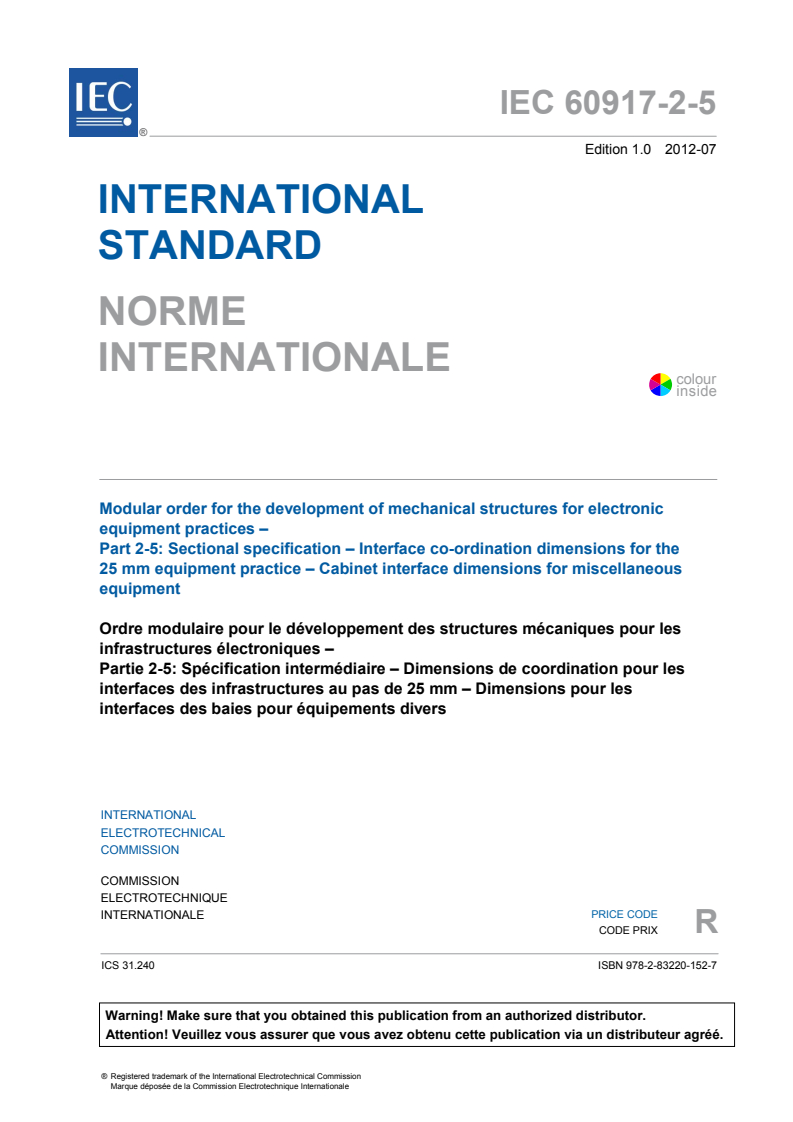 IEC 60917-2-5:2012 - Modular order for the development of mechanical structures for electronic equipment practices - Part 2-5: Sectional specification - Interface co-ordination dimensions for the 25 mm equipment practice - Cabinet interface dimensions for miscellaneous equipment Released:7/24/2012