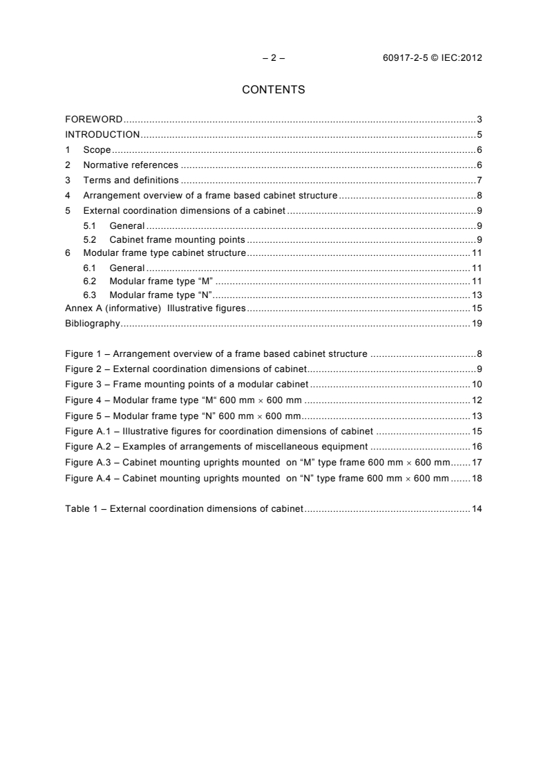 IEC 60917-2-5:2012 applies to a frame-based cabinet structure with the specification of interface dimensions for the installation of miscellaneous equipment. The frame structure provides the mounting planes with mounting points for the assembly of internal and external accessories. Unlike the existing standards IEC 60917-2-1 and IEC 60297-3-100, this standard allows cover parts like top covers and front/rear doors to exceed the cabinet's external coordination dimensions. Keywords: Modular cabinet, cabinet mounting, frame-based