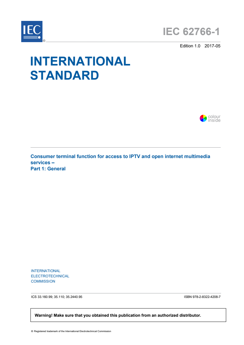 IEC 62766-1:2017 is a standard published by the International Electrotechnical Commission (IEC). Its full title is "Consumer terminal function for access to IPTV and open Internet multimedia services - Part 1: General". This standard covers: IEC 62766-1:2017(E) defines general common elements and specifies the structure of the IEC 62766 series, the scopes of, and relationships between the other parts