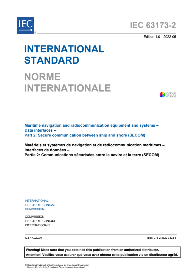 IEC 63173-2:2022 - Maritime navigation and radiocommunication equipment and systems - Data interfaces - Part 2: Secure communication between ship and shore (SECOM) Released:5/30/2022