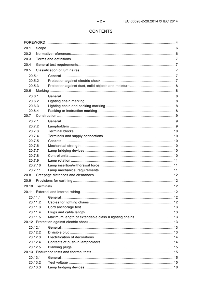 IEC 60598-2-20:2014 is an international standard published by the International Electrotechnical Commission (IEC) that specifies particular requirements for lighting chains. It covers lighting chains composed of series, parallel, or combined series/parallel connected light sources, intended for indoor or outdoor use on supply voltages not exceeding 250 V. This edition supersedes the previous 2010 version and excludes requirements for rope lights (sealed lighting chains), which are now addressed separately under IEC 60598-2-21.