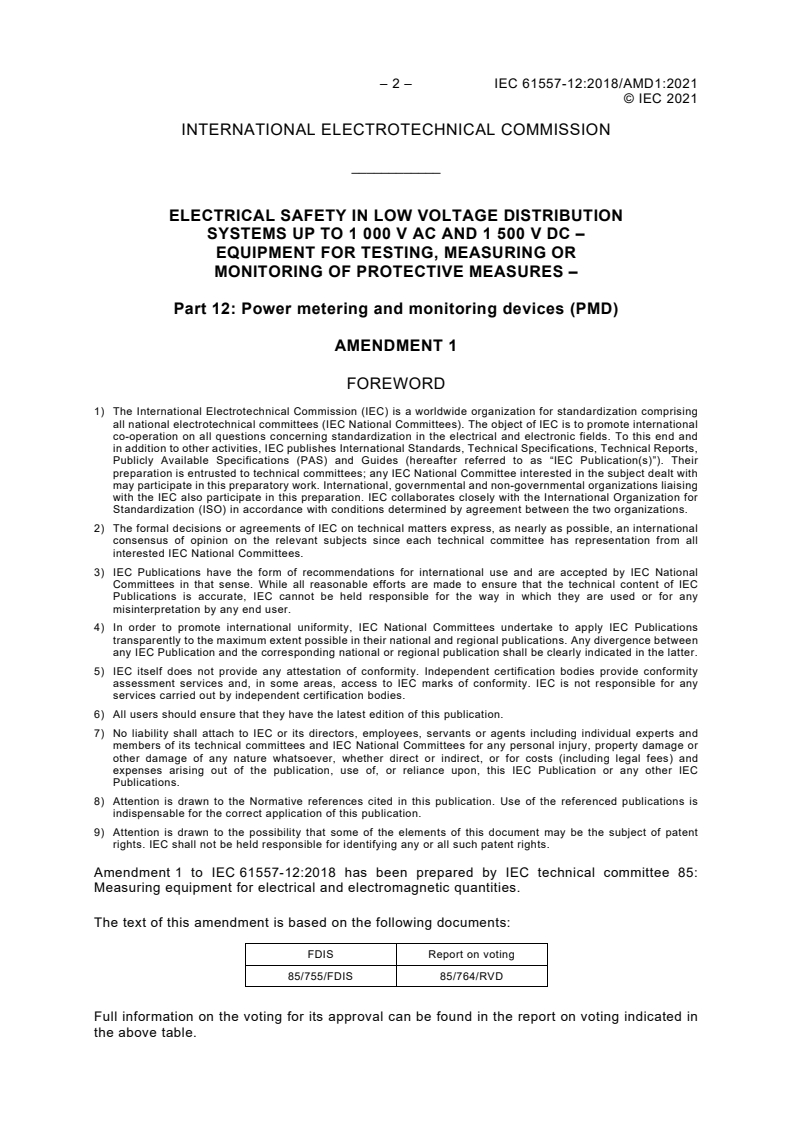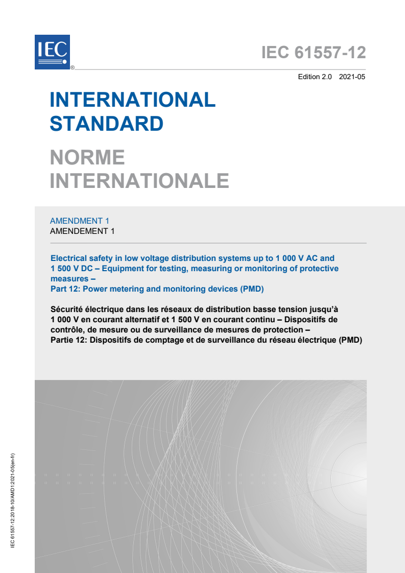 IEC 61557-12:2018/AMD1:2021 - Amendment 1 - Electrical safety in low voltage distribution systems up to 1 000 V AC and 1 500 V DC - Equipment for testing, measuring or monitoring of protective measures - Part 12: Power metering and monitoring devices (PMD) Released:5/21/2021
