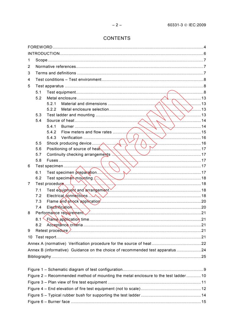 IEC 60331-3:2009 is a standard published by the International Electrotechnical Commission (IEC). Its full title is "Tests for electric cables under fire conditions - Circuit integrity - Part 3: Test method for fire with shock at a temperature of at least 830 °C for cables of rated voltage up to and including 0,6/1,0 kV tested in a metal enclosure". This standard covers: IEC 60331-3:2009 specifies the test apparatus and procedure and gives the performance requirements, including recommended flame application times, for low-voltage power cables of rated voltage up to and including 0,6/1,0 kV, and control cables with a rated voltage which are required to maintain circuit integrity when tested in a metal enclosure and when subject to fire and mechanical shock under specified conditions. This standard describes the means of sample preparation, the continuity checking arrangements, the electrical testing procedure, the method of burning the cables and the method of shock production and gives requirements for evaluating test results. NOTE All cables assessed by this method should first have been assessed against the test of IEC 60331-1 or IEC 60331-2. Such performance may be recognized by the marking according to Clause 11 of IEC 60331-1 or Clause 11 of IEC 60331-2. Annex A provides the method of verification of the burner and control system used for the test. It has the status of a horizontal standard in accordance with IEC Guide 104.