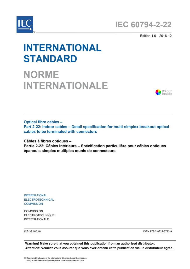 IEC 60794-2-22:2016 - Optical fibre cables - Part 2-22: Indoor cables - Detail specification for multi-simplex breakout optical cables to be terminated with connectors Released:12/7/2016