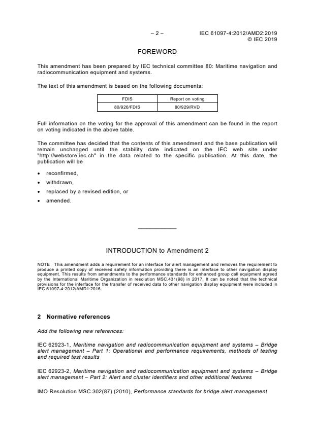 IEC 61097-4:2012/AMD2:2019 is the second amendment to Part 4 of the Global Maritime Distress and Safety System (GMDSS) standard. It focuses on the operational and performance requirements, testing methods, and mandated test results for Inmarsat-C ship earth stations and Inmarsat Enhanced Group Call (EGC) equipment. This amendment introduces critical updates enhancing alert management interfaces while modernizing requirements related to received safety information handling. Developed by IEC Technical Committee 80 (Maritime navigation and radiocommunication equipment), it aligns with International Maritime Organization (IMO) resolutions to improve maritime safety communication systems.