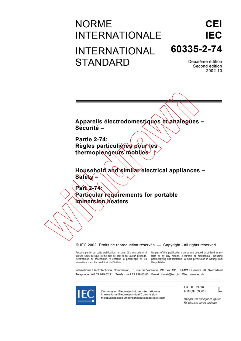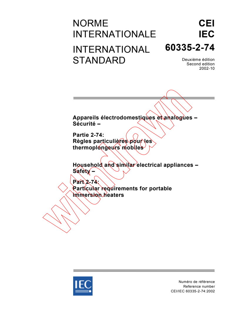 IEC 60335-2-74:2002 - Household and similar electrical appliances - Safety - Part 2-74: Particular requirements for portable immersion heaters