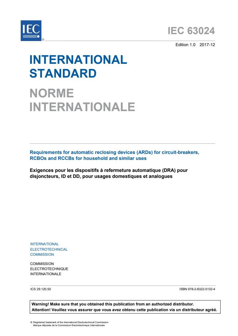 IEC 63024:2017 applies to automatic reclosing devices (ARDs) for household and similar uses, for rated voltage not exceeding 440 V AC, and which are intended to be used in combination with circuit-breakers, RCCBs and RCBOs, and designed either for factory assembly or for assembly on site.