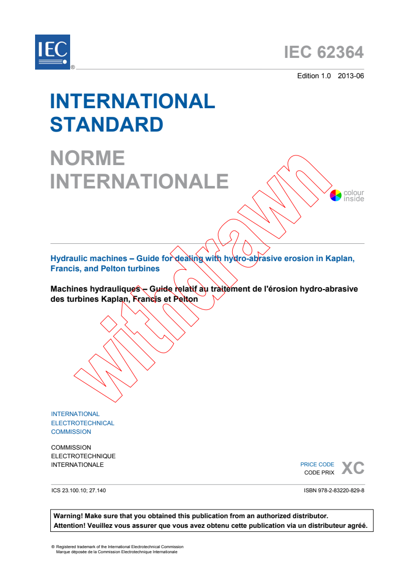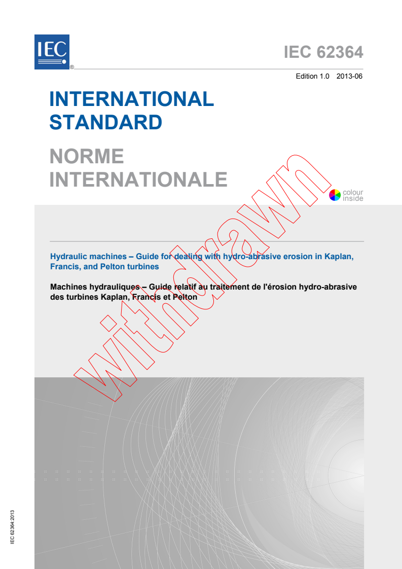 Keywords: IEC 62364, hydro-abrasive erosion, hydraulic turbines, Kaplan turbines, Francis turbines, Pelton turbines, turbine abrasion resistance, hydraulic design, abrasion rate, turbine maintenance, erosion mitigation, hydraulic machinery standards, abrasion resistant materials, particle abrasion, turbine operation.
