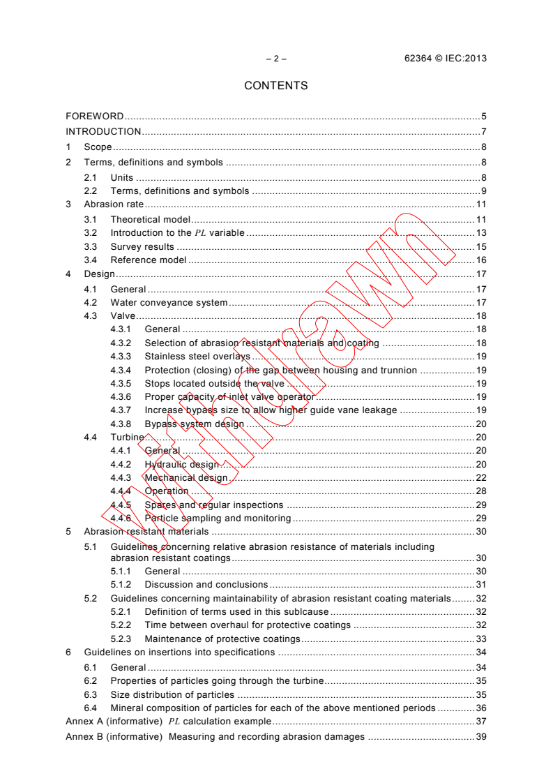 IEC 62364:2013 serves to present data on particle abrasion rates on several combinations of water quality, operating conditions, component materials, and component properties collected from a variety of hydro sites; develop guidelines for the methods of minimizing particle abrasion by modifications to hydraulic design for clean water. These guidelines do not include: - details such as hydraulic profile shapes which should be determined by the hydraulic design experts for a given site; - develop guidelines based on "experience data" concerning the relative resistance of materials faced with particle abrasion problems; - develop guidelines concerning the maintainability of abrasion resistant materials and hard facing coatings; - develop guidelines on a recommended approach, which owners could and should take to ensure that specifications communicate the need for particular attention to this aspect of hydraulic design at their sites without establishing criteria which cannot be satisfied because the means are beyond the control of the manufacturers - and develop guidelines concerning operation mode of the hydro turbines in water with particle materials to increase the operation life. It is assumed that the water is not chemically aggressive. Since chemical aggressiveness is dependent upon so many possible chemical compositions, and the materials of the machine, it is beyond the scope of this Guide to address these issues. It is assumed that cavitation is not present in the turbine. Cavitation and abrasion may reinforce each other so that the resulting erosion is larger than the sum of cavitation erosion plus abrasion erosion. The quantitative relationship of the resulting abrasion is not known and it is beyond the scope of this guide to assess it, except to recommend that special efforts be made in the turbine design phase to minimize cavitation. Large solids (e.g. stones, wood, ice, metal objects, etc.) traveling with the water may impact turbine components and produce damage. This damage may in turn increase the flow turbulence thereby accelerating wear by both cavitation and abrasion. Abrasion resistant coatings can also be damaged locally by impact of large solids. It is beyond the scope of this Guide to address these issues. Key words: hydraulic, turbines, hydro-abrasive erosion