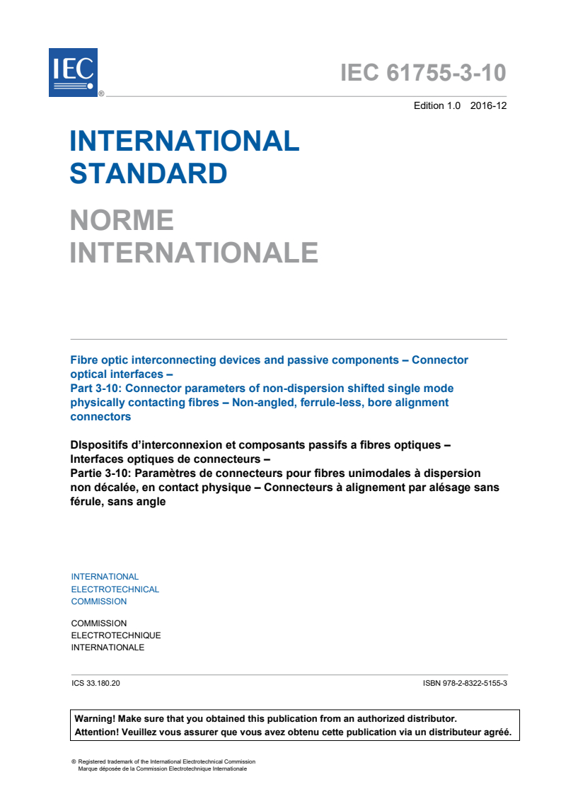 IEC 61755-3-10:2016 is a standard published by the International Electrotechnical Commission (IEC). Its full title is "Fibre optic interconnecting devices and passive components - Connector optical interfaces - Part 3-10: Connector parameters of non-dispersion shifted single mode physically contacting fibres - non-angled, ferrule-less, bore alignment connectors". This standard covers: IEC 61755-3-10: 2016 defines certain dimensional limits of a 125 mm diameter single mode silica fibre optical interface and an alignment bore to meet specific requirements for non-angled fibre-to-fibre interconnection as defined in IEC 61755-2-1. The silica fibre materials specified in this document are suitable for use in categories C, U, E and O as defined in IEC 61753-1.