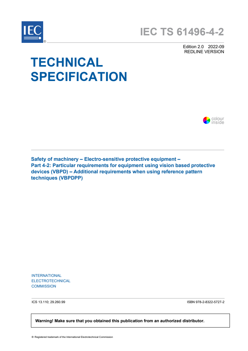 IEC TS 61496-4-2:2022 - Safety of machinery - Electro-sensitive protective equipment - Part 4-2: Particular requirements for equipment using vision based protective devices (VBPD) - Additional requirements when using reference pattern techniques (VBPDPP) Released:9/16/2022