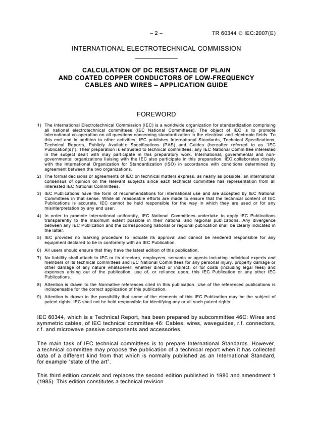 IEC TR 60344:2007 is an important technical report published by the International Electrotechnical Commission (IEC) providing a comprehensive application guide for calculating the direct current (d.c.) resistance of plain and coated copper conductors used in low-frequency cables and wires, particularly within telecommunications. This third edition updates previous methodologies with significant improvements in resistance calculation accuracy and incorporates the February 2012 corrigendum. The standard applies globally and aids in ensuring harmonized measurement and design criteria in copper conductor manufacturing and application.