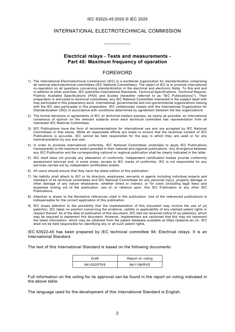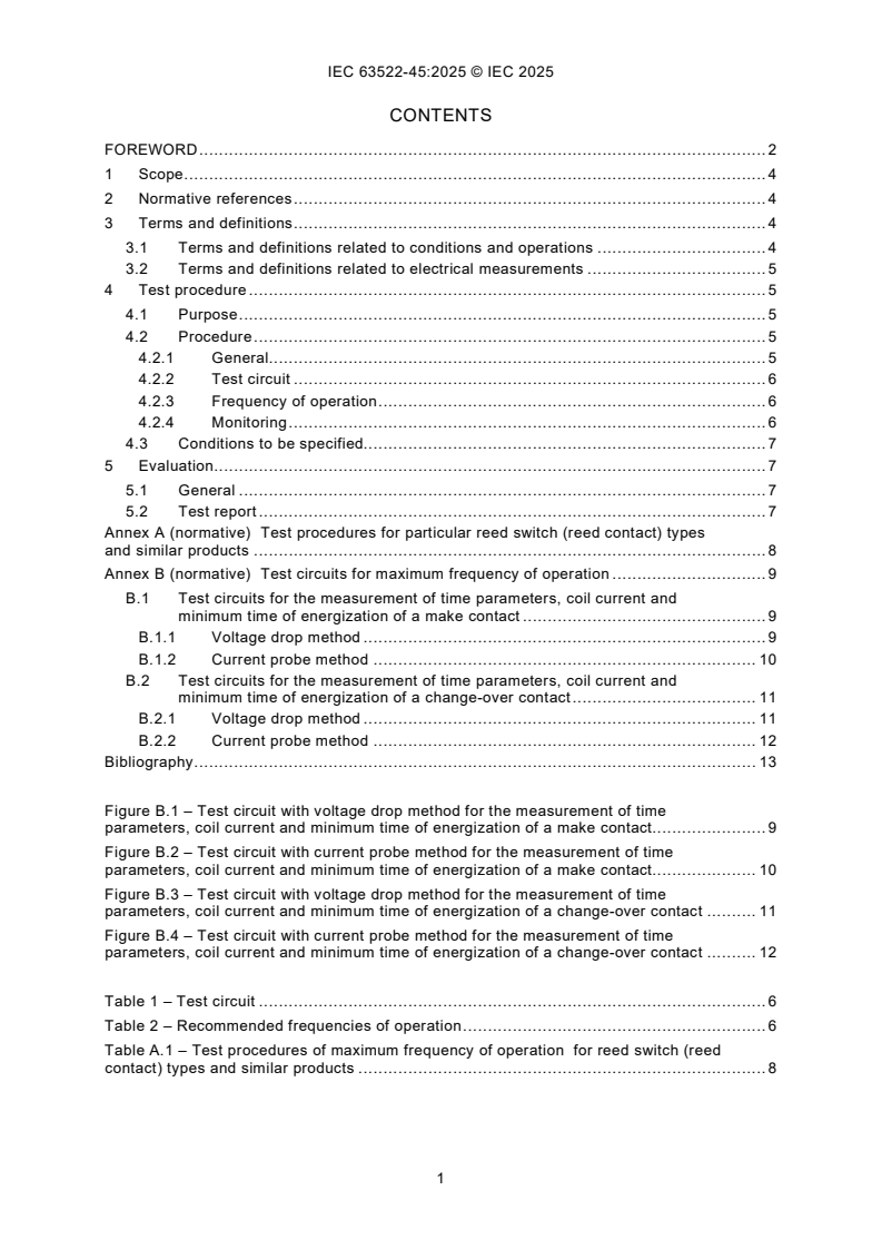 Keywords: IEC 63522-45:2025, electrical relays, electromechanical relays, maximum frequency of operation, relay testing, relay endurance test, reed relay test, relay reliability, coil current measurement, voltage drop method, current probe method, IEC relay standards.