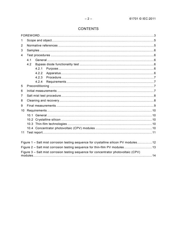 IEC 61701:2011 describes test sequences useful to determine the resistance of different PV modules to corrosion from salt mist containing Cl- (NaCl, MgCl2, etc.). All tests included in the sequences, except the bypass diode functionality test, are fully described in IEC 61215, IEC 61646, IEC 62108, IEC 61730-2 and IEC 60068-2-52. This Standard can be applied to both flat plate PV modules and concentrator PV modules and assemblies. Salt mist test is based on IEC 60068-2-52 rather than IEC 60068-2-11 as in edition 1 since the former standard is much more widely used in the electronic component field. According to this change the new edition 2 includes a cycling testing sequence that combines in each cycle a salt fog exposure followed by humidity storage under controlled temperature and relative humidity conditions. This testing sequence is more suitable to reflect the corrosion processes that happen in PV modules subjected to permanent or temporary corrosive atmospheres.