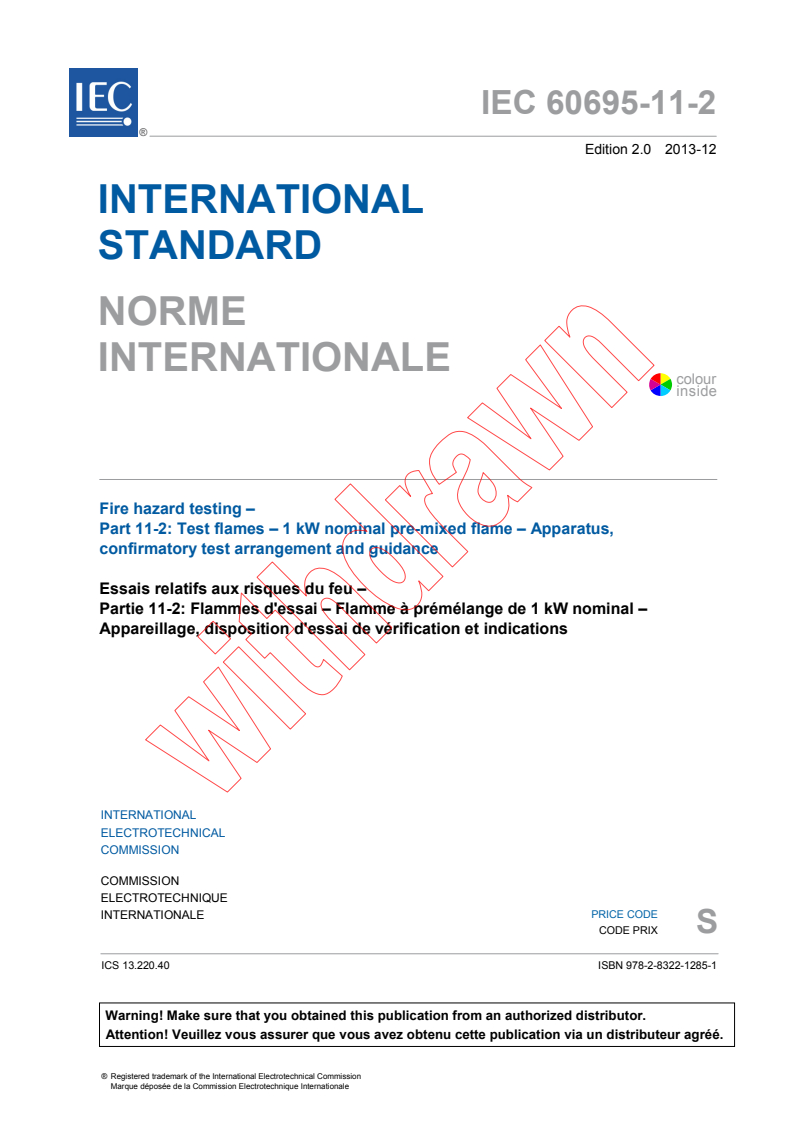 - technical changes to the test flame confirmation procedure (see 6.2 and 6.3). It has the status of a horizontal standard in accordance with IEC Guide 104 and ISO/IEC Guide 51. Key words: Flame, Pre-mixed flame 1 kW test flame