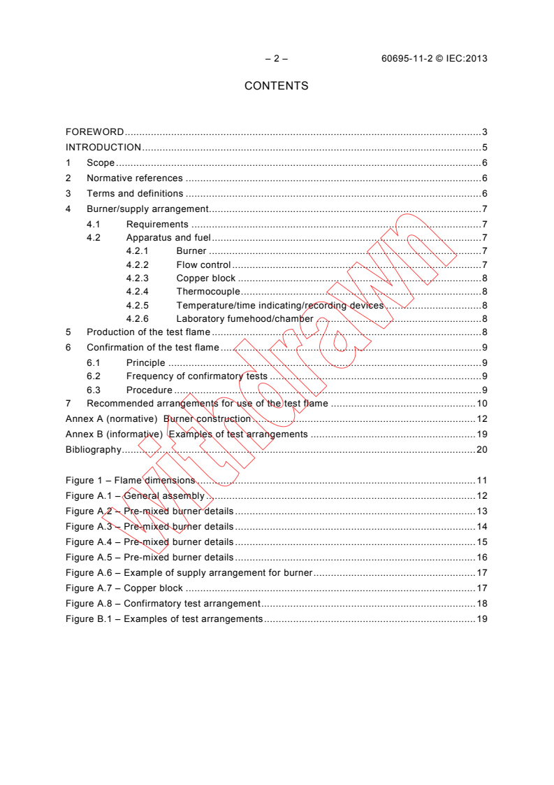 IEC 60695-11-2:2013 gives the requirements for the production and confirmation of a nominal 1 kW, propane/air pre-mixed test flame. This basic safety publication is intended for use by technical committees in the preparation of standards in accordance with the principles laid down in IEC Guide 104 and ISO/IEC Guide 51. One of the responsibilities of a technical committee is, wherever applicable, to make use of basic safety publications in the preparation of its publications. The requirements, test methods or test conditions of this basic safety publication will not apply unless specifically referred to or included in the relevant publications. This second edition of IEC 60695-11-2 cancels and replaces the first edition published in 2003. It constitutes a technical revision. This second edition includes the following significant technical changes with respect to the previous edition: - editorial changes to align with other TC 89 test flame publications; - editorially updated throughout; - technical changes to the burner set up requirements (see 4.1, 4.2.2, 5 and Fig. A.6); - technical changes to the test flame confirmation procedure (see 6.2 and 6.3). It has the status of a horizontal standard in accordance with IEC Guide 104 and ISO/IEC Guide 51. Key words: Flame, Pre-mixed flame 1 kW test flame
