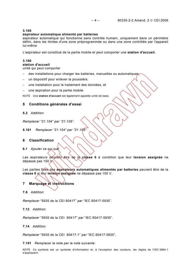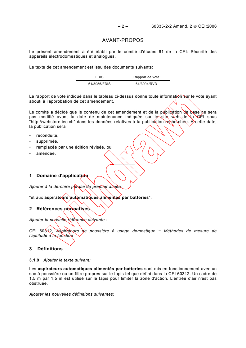 IEC 60335-2-2:2002/AMD2:2006 - Amendment 2 - Household and similar electrical appliances - Safety - Part 2-2: Particular requirements for vacuum cleaners and water-suction cleaning appliances Released:7/24/2006 Isbn:283188747X