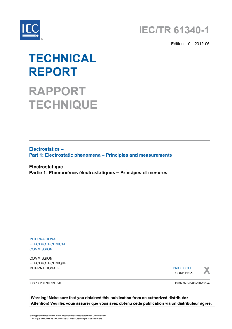 IEC TR 61340-1:2012 - Electrostatics - Part 1: Electrostatic phenomena - Principles and measurements Released:6/26/2012