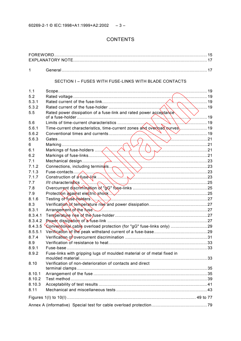 This standard is divided into five sections, each dealing with a specific example of standardized fuse for use by authorized persons: Section I: Fuses with fuse-links with blade contacts. Section II: Fuses with fuse-links for bolted connections. Section III: Fuses with fuse-links having cylindrical contact caps. Section IV: Fuses with fuse-links with offset blade contacts. Section V: Fuses with fuse-links having "gD" and "gN" characteristics. NOTE - The following fuse systems are standardized systems in respect to their safety aspects. The National Committees may select from the examples of standardized fuses one or more systems for their own standards.