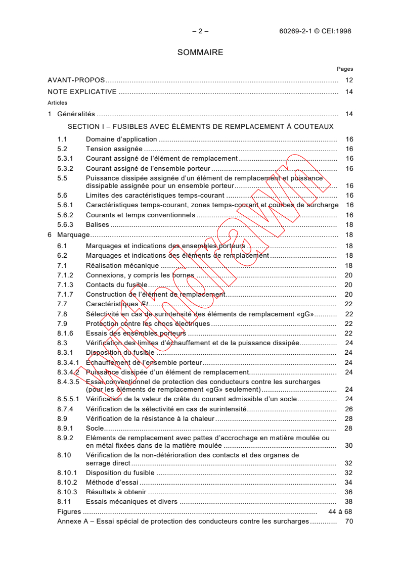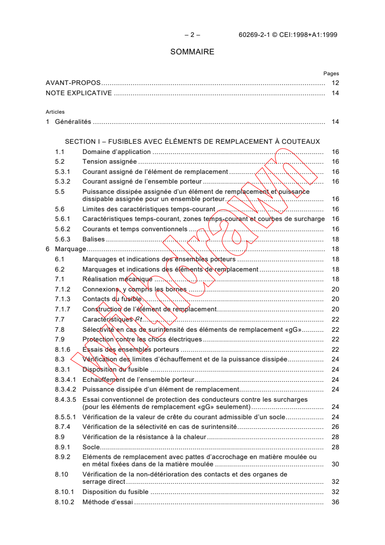 La présente norme est divisée en cinq sections traitant chacune d'un exemple spécifique de fusible normalisé destiné à être utilisé par des personnes habilitées: Section I: Fusibles avec éléments de remplacement à couteaux. Section II: Fusibles avec éléments de remplacement à platines. Section III: Fusibles avec éléments de remplacement à capsules cylindriques. Section IV: Fusibles avec éléments de remplacement à couteaux déportés. Section V: Fusibles dont les éléments de remplacement ont des caractéristiques "gD" et "gN". NOTE - Les systèmes de fusibles suivants sont normalisés en ce qui concerne les aspects de sécurité. Les Comités nationaux peuvent choisir, parmi les exemples de fusibles normalisés, un ou plusieurs systèmes pour leurs normes nationales.