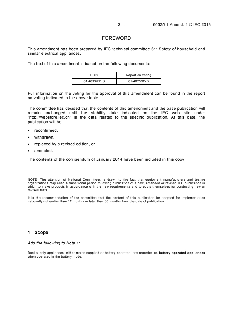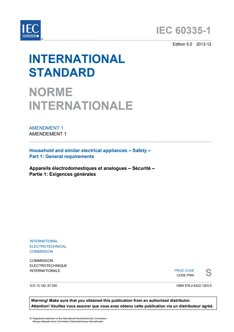 Keywords: IEC 60335-1 amendment, household electrical appliance safety, battery-operated appliance standards, electrical appliance testing, leakage current limits, equipment marking requirements, temperature rise limits, moisture resistance tests, electrical safety standards.