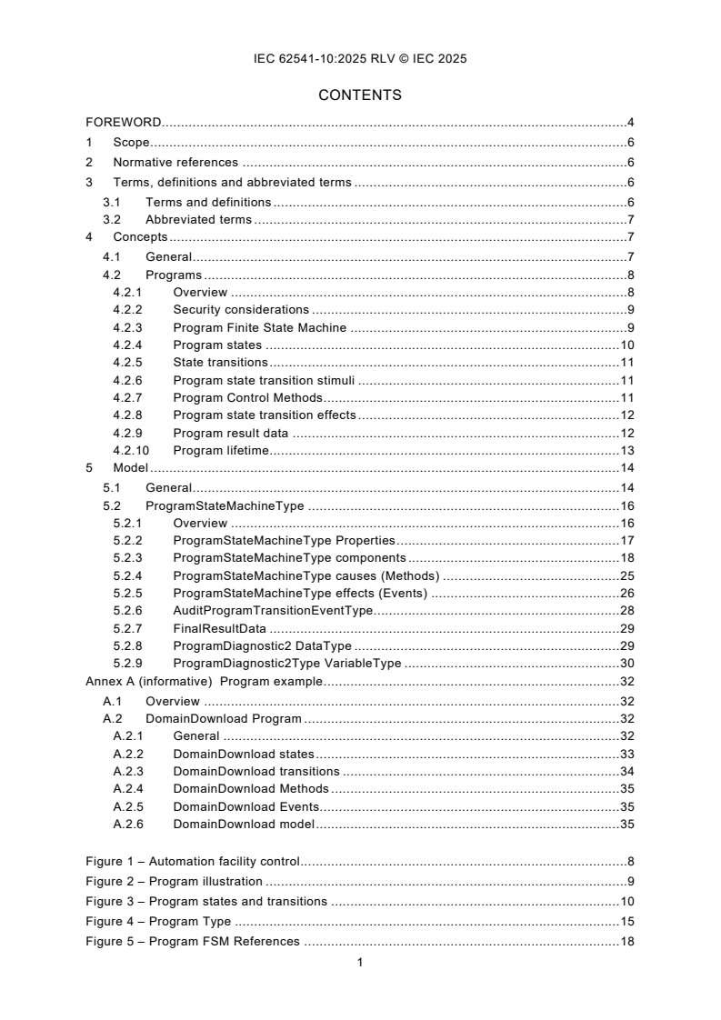 IEC 62541-10:2025 - "OPC Unified Architecture - Part 10: Programs" defines the Information Model for Programs in OPC UA. It specifies the NodeClasses, standard Properties, Methods and Events and the associated behavior and information needed to represent and manage Programs in an OPC UA AddressSpace. The document is part of the IEC 62541 series and the fourth edition (2025) replaces the 2020 third edition and introduces a technical revision (notably alignment of the StateMachine table format). An illustrative DomainDownload Program example is provided in Annex A.