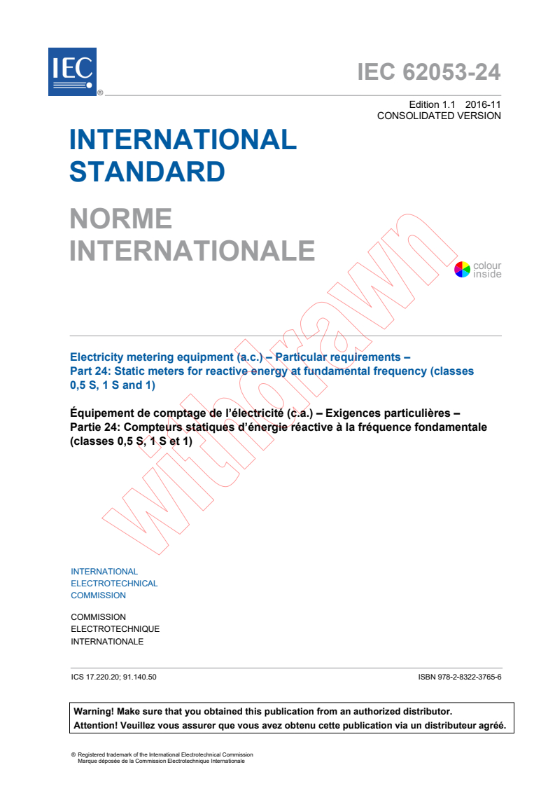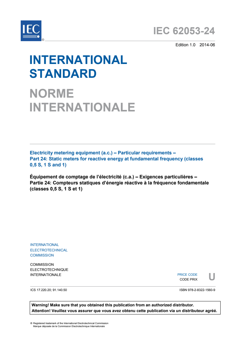 IEC 62053-24:2014 is an international standard published by the International Electrotechnical Commission (IEC) that specifies particular requirements for static electricity meters used to measure reactive energy in alternating current (a.c.) electrical systems. This standard focuses exclusively on newly manufactured static var-hour meters - transformer operated meters of accuracy classes 0.5 S and 1 S, and direct connected meters of accuracy class 1. These meters are designed for fundamental frequency measurement of reactive energy in 50 Hz or 60 Hz networks.