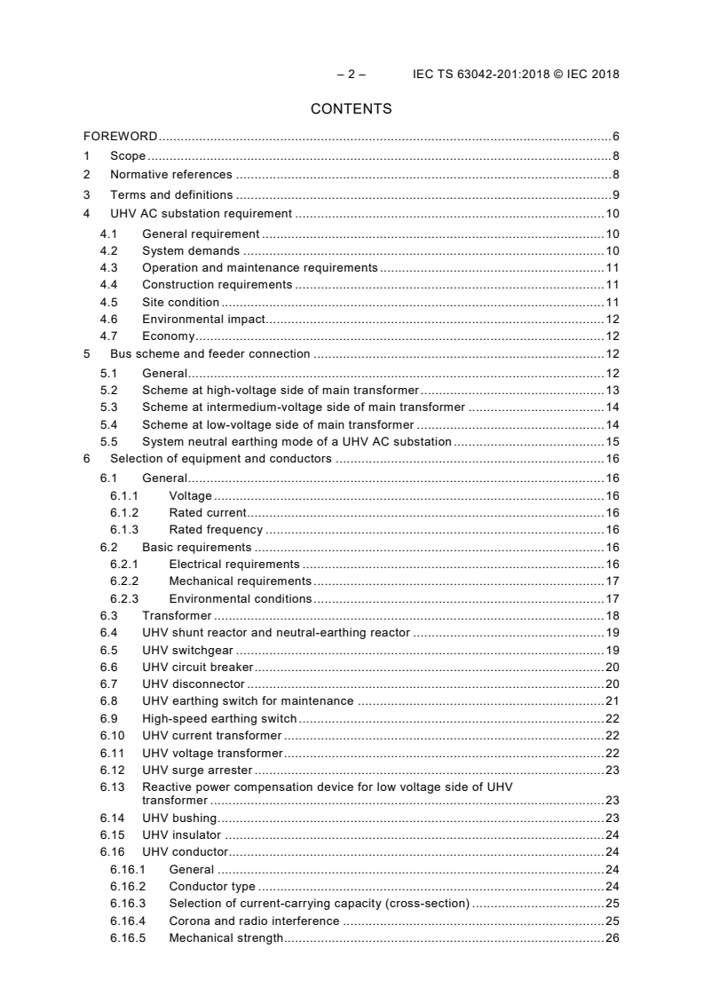 IEC TS 63042-201:2018 is a technical specification published by the International Electrotechnical Commission (IEC). Its full title is "UHV AC transmission systems - Part 201: UHV AC substation design". This standard covers: IEC TS 63042-201:2018(E), which is a Technical Specification, provides common rules for the design of substations with the highest voltages of AC transmission systems exceeding 800 kV, so as to provide safety and proper functioning for the intended use.