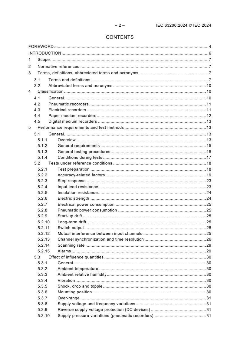 IEC 63206:2024 specifies the characterization, the classification (e.g.: analogue chart recorder, digital recorder, X-Y recorder, paperless recorder, event recorder, data logger, and data acquisition device, etc.) and performance evaluation methods of recorders. It covers type tests as well as routine tests.