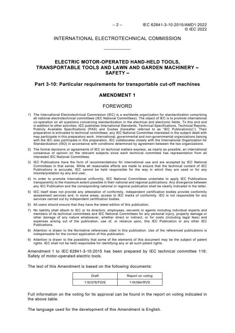 Keywords: IEC 62841-3-10 Amendment 1, transportable cut-off machines, electric motor-operated tools, safety standards, mechanical strength, noise and vibration emissions, IEC standards, hand-held tools safety, equipment certification, industrial tools safety, electrical equipment regulation