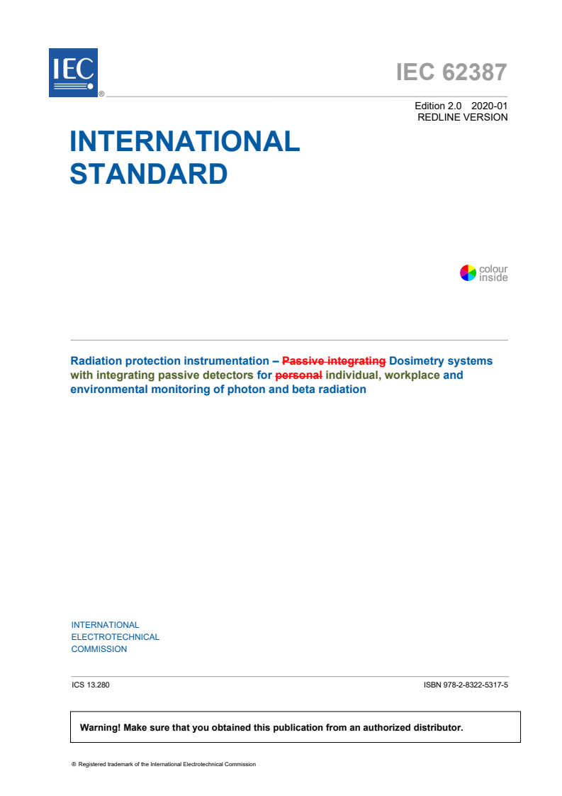IEC 62387:2020 - Radiation protection instrumentation - Dosimetry systems with integrating passive detectors for individual, workplace and environmental monitoring of photon and beta radiation Released:1/31/2020