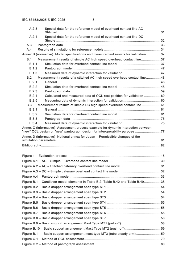 - IEC 63453:2025 complements other railway electrification and interoperability standards addressing current collection quality and infrastructure requirements. Users should consult relevant IEC and national railway standards when applying validation results to certification and deployment.