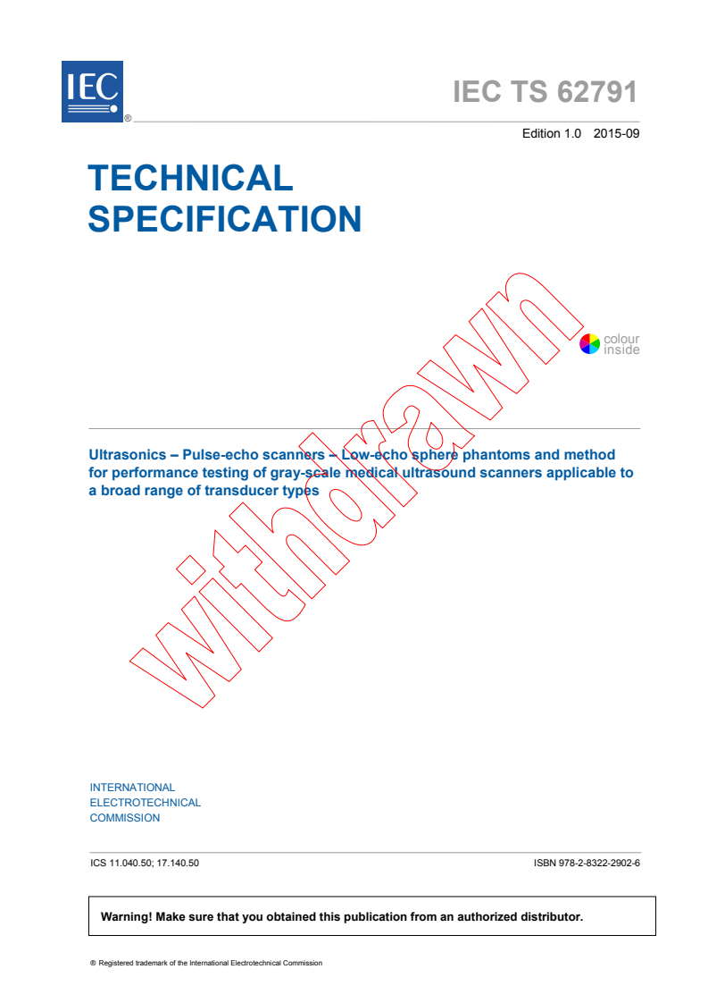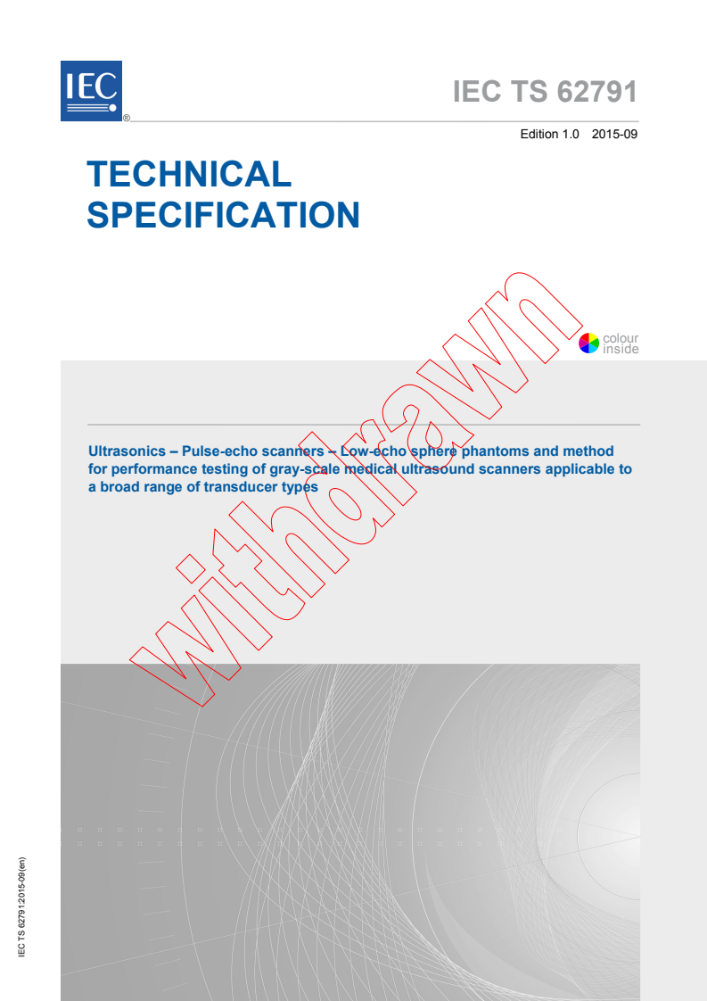 IEC TS 62791:2015 - Ultrasonics - Pulse-echo scanners - Low-echo sphere phantoms and method for performance testing of gray-scale medical ultrasound scanners applicable to a broad range of transducer types Released:9/8/2015