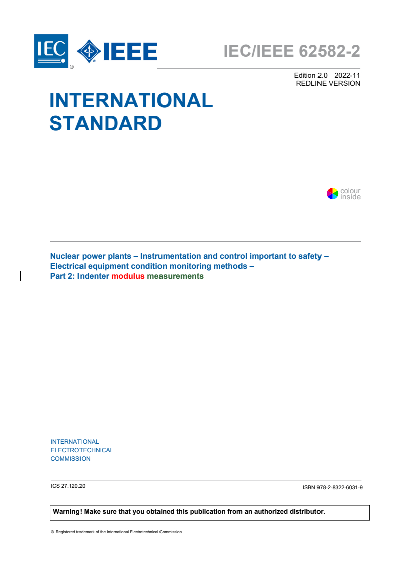 IEC/IEEE 62582-2:2022 RLV - Nuclear power plants - Instrumentation and control important to safety - Electrical equipment condition monitoring methods - Part 2: Indenter measurements Released:11/4/2022
