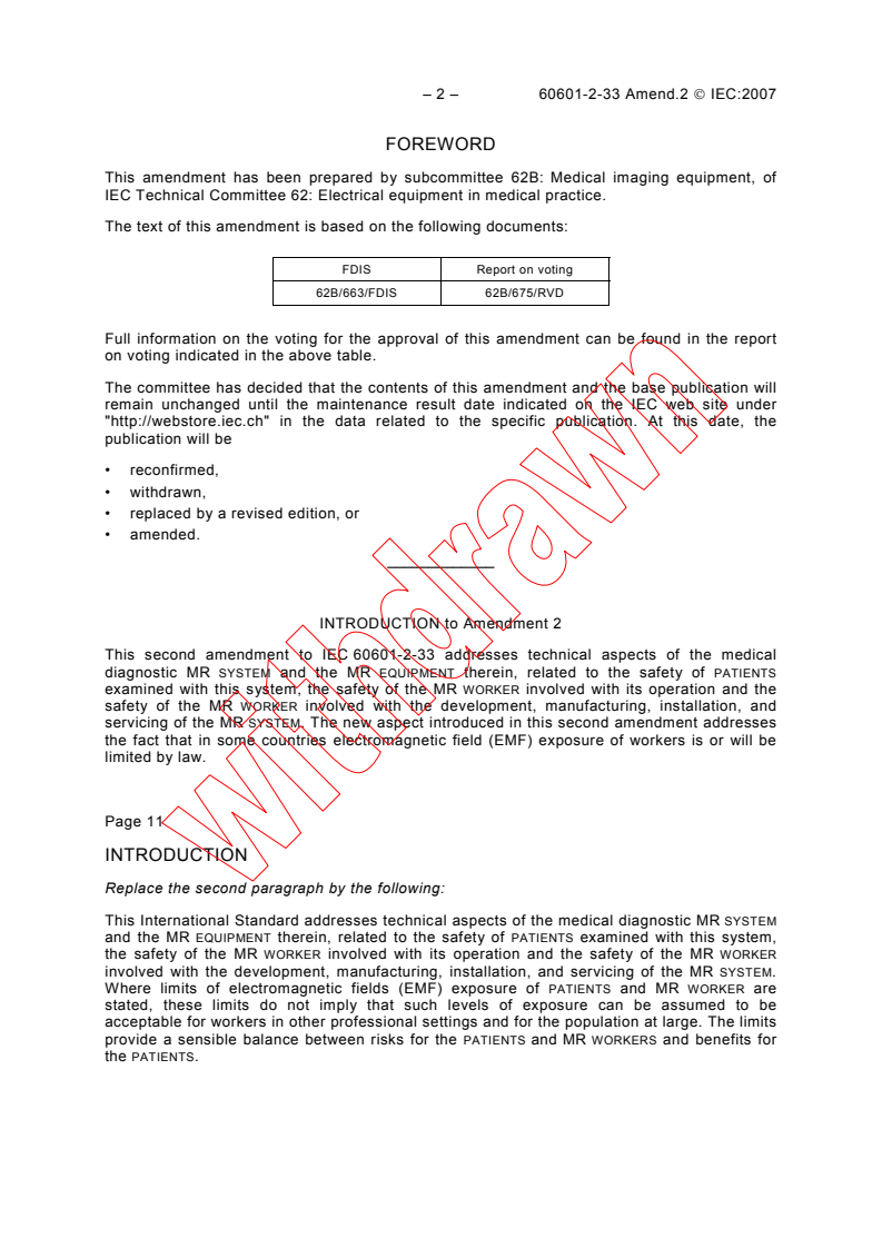 Keywords: IEC 60601-2-33 amendment, magnetic resonance safety, MR equipment, medical electrical equipment, EMF exposure limits, MR workers, MR patients, electromagnetic fields, occupational safety, medical imaging standards, acoustic noise protection, medical device safety standards.