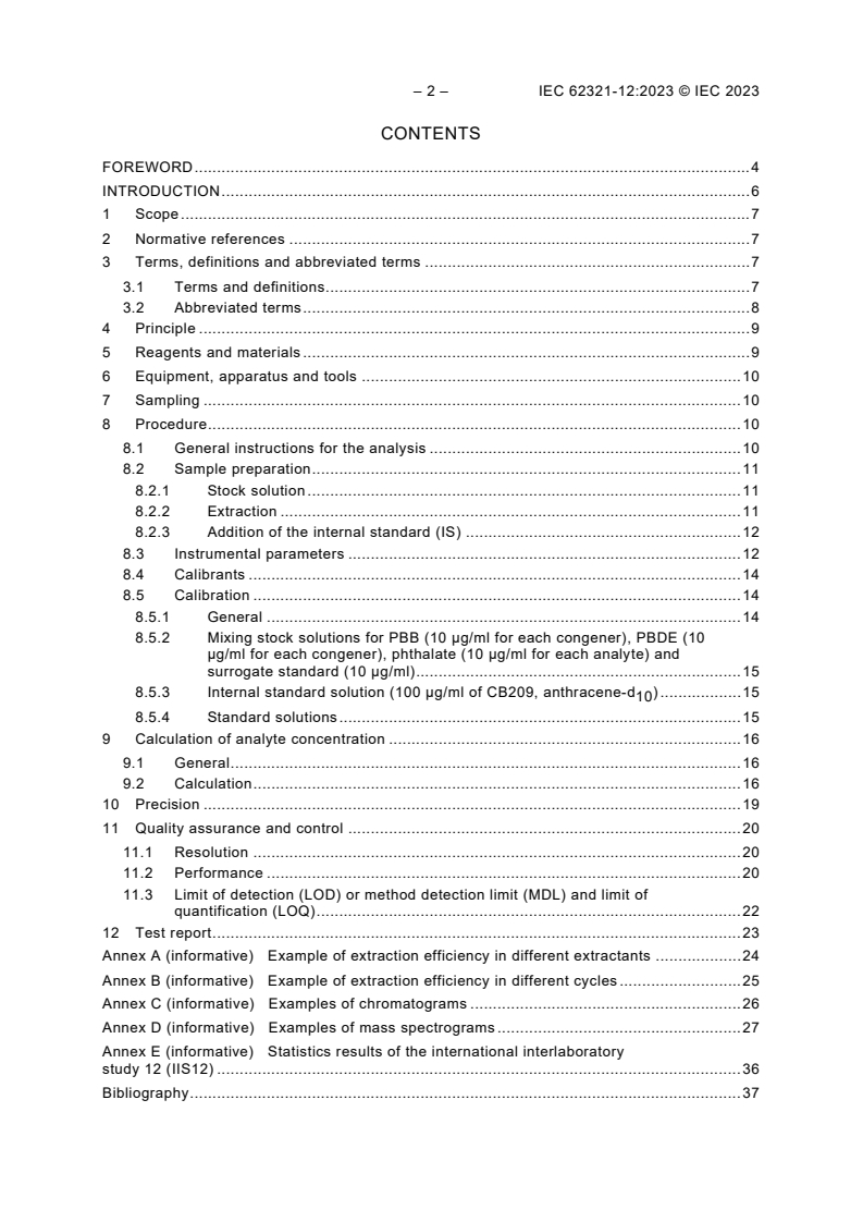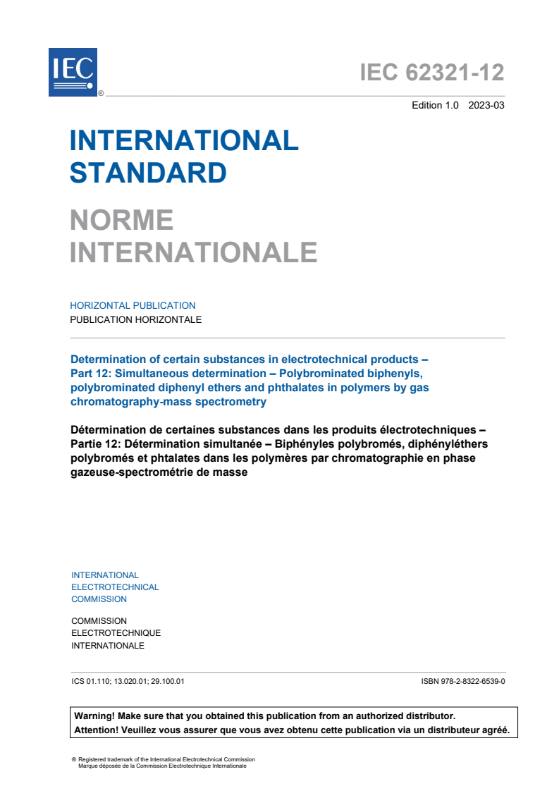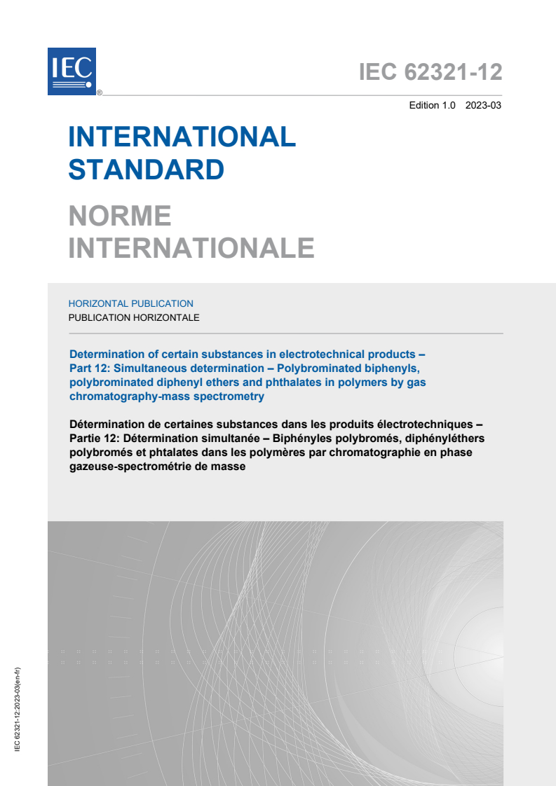 IEC 62321-12:2023 is a standard published by the International Electrotechnical Commission (IEC). Its full title is "Determination of certain substances in electrotechnical products - Part 12: Simultaneous determination – Polybrominated biphenyls, polybrominated diphenyl ethers and phthalates in polymers by gas chromatography-mass spectrometry". This standard covers: IEC 62321-12:2023 specifies a reference test method for the simultaneous determination of polybrominated biphenyls, polybrominated diphenyl ethers, and four phthalates: di-isobutyl phthalate (DIBP), di-n-butyl phthalate (DBP), benzylbutyl phthalate (BBP), di-(2-ethylhexyl) phthalate (DEHP) in polymers of electrotechnical products. The extraction technique described in this document is the ultrasonic-assisted extraction used for simultaneous extraction for sample preparation. Gas chromatography-mass spectrometry (GC-MS) is considered as the reference technique for the measurement of the simultaneous determination of analytes in the range of 25 mg;kg to 2 000 mg;kg. The test method using ultrasonic-assisted extraction followed by GC-MS detection has been evaluated by the tests of polypropylene (PP), polyvinylchloride (PVC), acrylonitrile butadiene styrene (ABS), acrylate rubber (ACM), polystyrene (PS), polyurethane (PU) and polyethylene (PE) materials. This document has the status of a horizontal publication in accordance with IEC Guide 108.