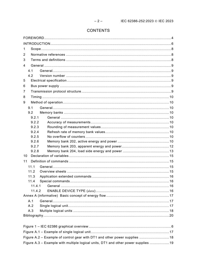 IEC 62386-252:2023 is an international standard developed by the International Electrotechnical Commission (IEC) that specifies the particular requirements for energy reporting within digital addressable lighting interface (DALI) systems. It targets device type 51, focusing on energy reporting functionalities through memory banks embedded in control gear devices. This standard supplements the broader IEC 62386 series by defining the protocols and data exchange requirements specific to energy measurement and reporting.