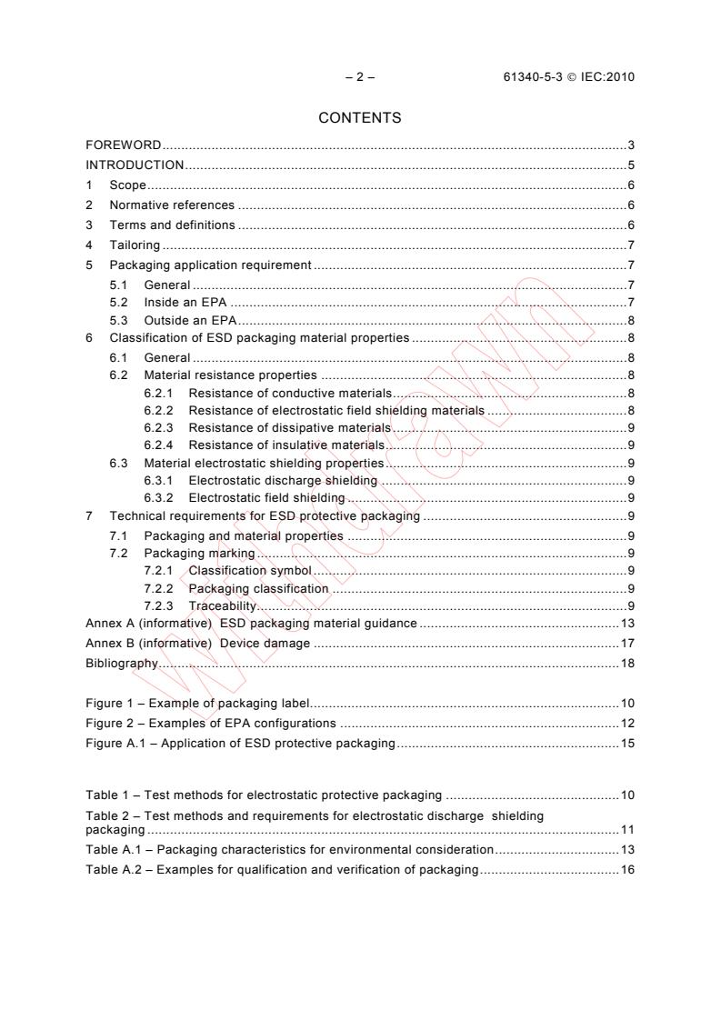 IEC 61340-5-3:2010 defines the ESD protective packaging properties needed to protect electrostatic discharge sensitive devices (ESDS) through all phases of production, transport and storage. Test methods are referenced to evaluate packaging and packaging materials for these product and material properties. Performance limits are provided. This standard does not address protection from electromagnetic interference (EMI), radio frequency interference (RFI), electromagnetic pulsing (EMP) nor protection of volatile materials.
