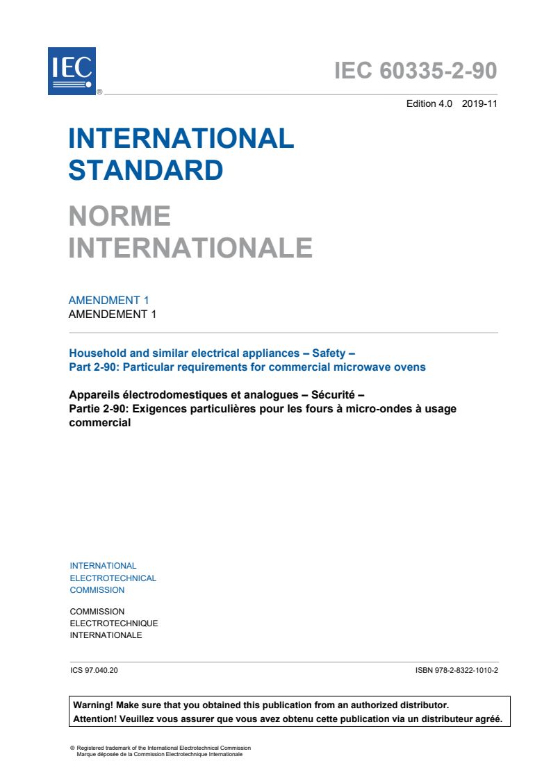 IEC 60335-2-90:2015/AMD1:2019 - Amendment 1 - Household and similar electrical appliances - Safety - Part 2-90: Particular requirements for commercial microwave ovens Released:11/15/2019